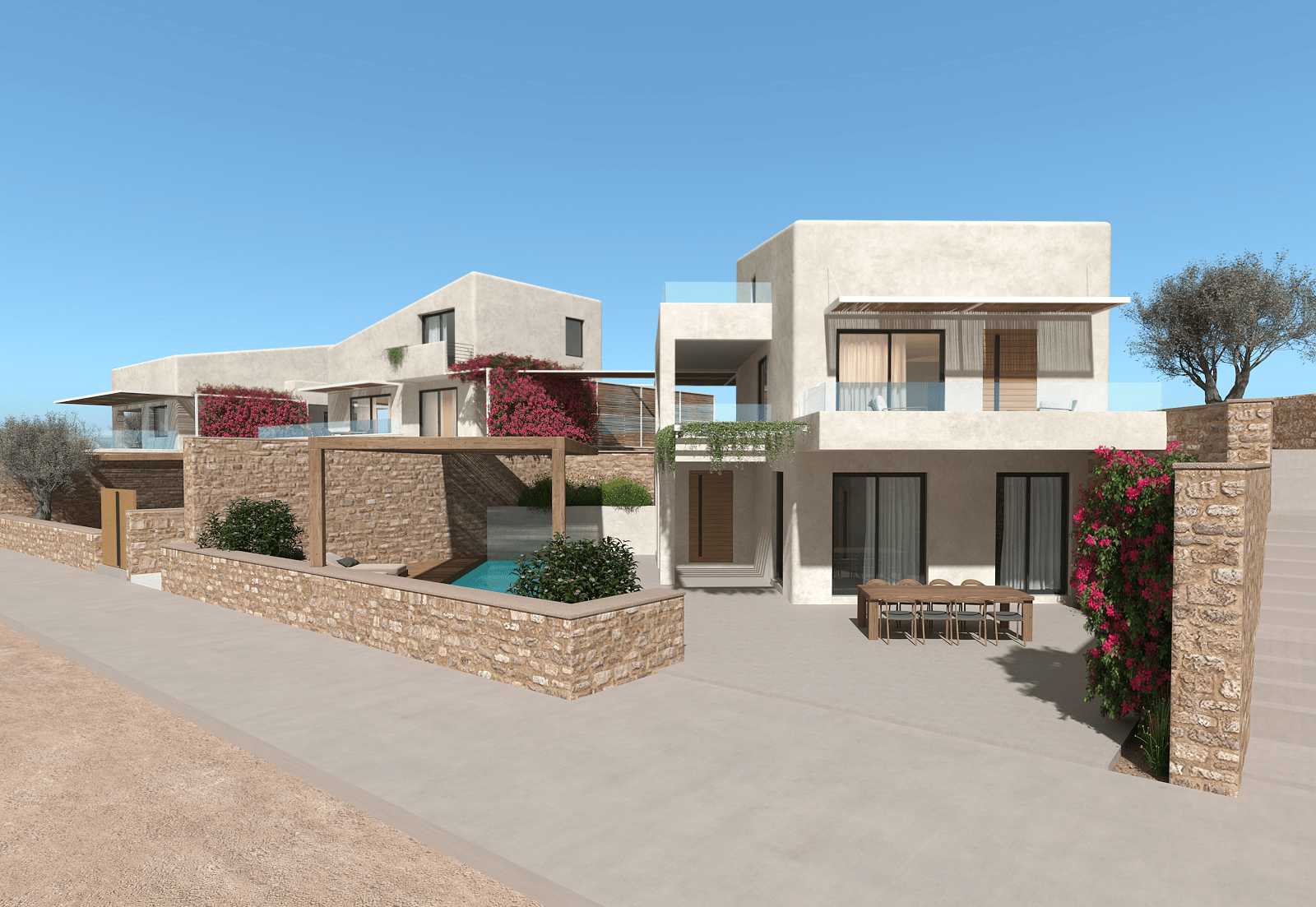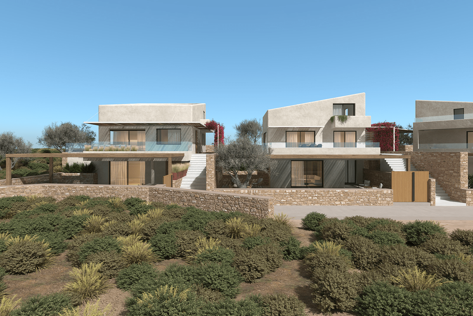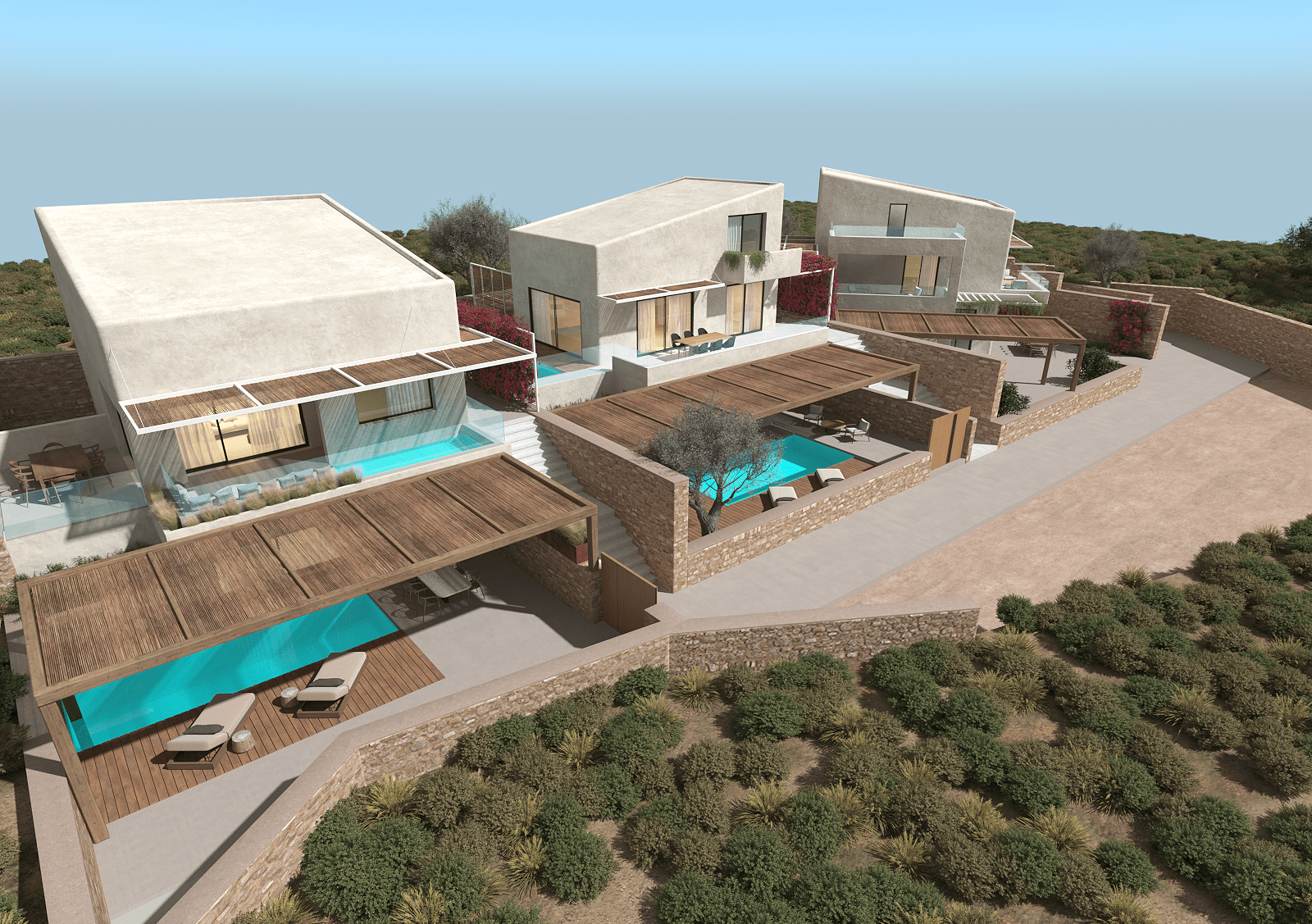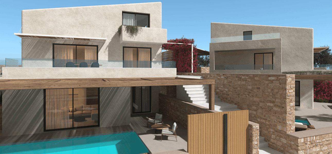 Το έργο αφορά την κατασκευή συγκροτήματος έξι κατοικιών, κατανεμημένων σε τρία ανεξάρτητα κτίρια. Κάθε διαμέρισμα σχεδιάζεται με πλήρη ιδιωτικότητα, με ιδιωτική πισίνα, ανεξάρτητη είσοδο και χώρους στάθμευσης. Η αρχιτεκτονική σύνθεση χαρακτηρίζεται από μοντέρνα, αιγαιοπελαγίτικη διάθεση, με λευκούς όγκους, φυσικά υλικά και αρμονία με το ανάγλυφο της περιοχής.